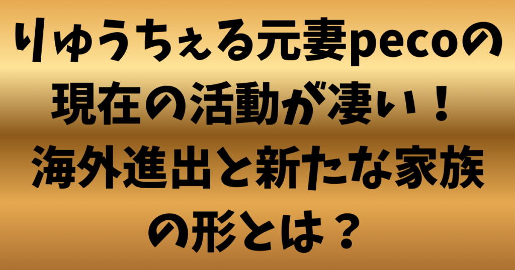 りゅうちぇるの元妻として知られるpecoさん。 ryuchellさんの突然の死去から2年近くが経ち、pecoさんの現在の活動や生活に注目が集まっています。 今回は、pecoさんの最新の活動状況や、新たな家族の形について詳しくお伝えします。 海外進出への意欲的な... -